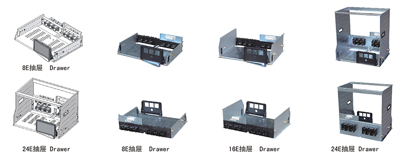 框架为组合式结构,基本骨架由C型材组装而成,框架的全部结构件经过镀锌(或采用覆铝锌板)。C型材是以25mm为模数孔的钢板弯制而成,抽屉采用大刀片式,抽屉后板可选用塑料的或金属的。